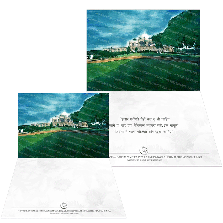 History: This Greetings Card/Sentimental Card/Romantic Card for expressing heartfelt sentiments, features a photoart presentation of a Humayun's Mausoleum in New Delhi, India. The mausoleum is a UNESCO World Heritage site and was one of the first architectural marvels to be built by the Gurkani. The mammoth structure was sponsored by Bega Begum, queen and chief consort of the second Gurkani (Mughal) emperor, Nasir-ud-din-Muhammad Humayun. The Prewritten version of this Greetings Card comes with a message in Hindi.