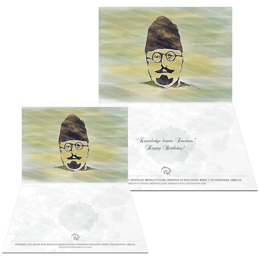History: This Greetings Card for Birthdays features a photoart presentation of Maulana Abul Kalam Azad. Born on the 11th of November in 1886 Ce., Maulana Azad was an Indian Revolutionary, a poet, a writer and the first Minister of Education of Independent India. His full name was Abul Kalam Ghulam Muhiyuddin Ahmed Bin Khairuddin Hussani ( Maulana Azad being his Pen name). Maulana Azad deliberately used the word 'Azad' in his name to convey his love for Freedom - the word Azad means to be Free.