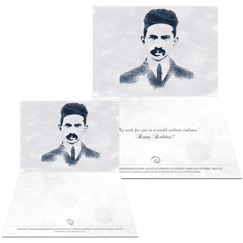 History: This Greetings Card for Birthdays features a photoart representation of a yesteryear photo of Mohandas Karamchand Gandhi, more popularly known as Mahatma Gandhi. Born on the 2nd of October in 1869 Ce, Mahatma Gandhi was an advocate, a revolutionary and a political activist. Mahatma gandhi is widely remembered and celebrated for being the first to apply the doctrine of non-violence in politics.