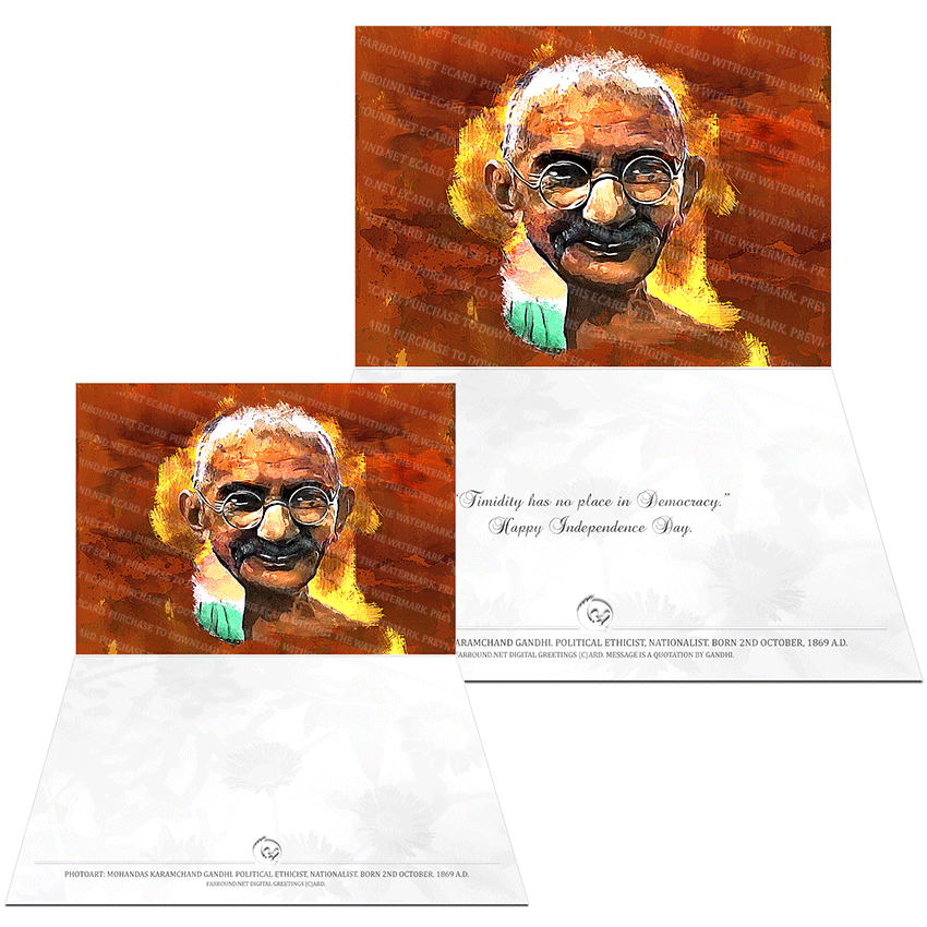 History: This Greetings Card/Independence Day Card/Celebratory Card for commemorating historical people and the Indian Independence Movement, features a photoart presentation of a yesteryear photo of Mohandas Karamchand Gandhi, better known as Mahatma Gandhi. Born on the 2nd of October in 1869 Ce., Mahatma Gandhi was an advocate, an Indian revolutionary and an Indian political activist. He is widely remembered and celebrated for being the first to apply the doctrine of non-violence in politics. Mahatma Gandhi is widely regarded as a prominent pillar of the Indian Freedom Movement, and informally honoured as the Father of the Nation (India).