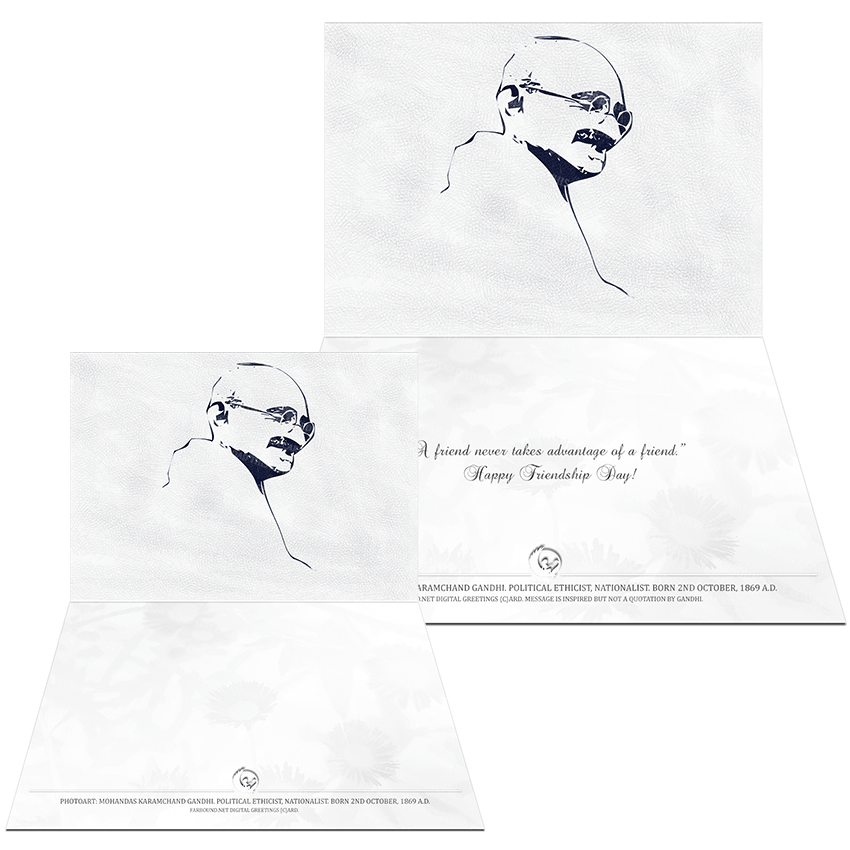 History: This Greetings Card/Sentimental Card/Friendship Day Card for commemorating historical people and expressing heartfelt sentiments to a friend, features a photoart presentation of a yesteryear photo of Mohandas Karamchand Gandhi, better known as Mahatma Gandhi. Born on the 2nd of October in 1869 Ce, Mahatma Gandhi was an advocate, an Indian revolutionary and an Indian political activist. He is widely remembered and celebrated for being the first to apply the doctrine of non-violence in politics. Mahatma Gandhi is informally honoured as the Father of the Nation (India).