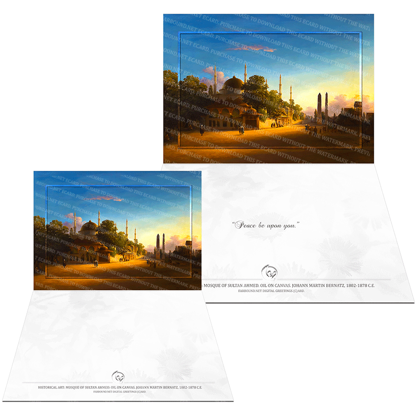 History: This Greetings Card/Good Wishes Card/Festive Card/Muharram Card for sending good wishes to friends and family on Muharram, features a historical painting titled,'View of the Sultan Ahmed Mosque in Istanbul from the former Hippodrome with the Egyptian Obelisk'. The oil on canvas painting was created by artist Johann Martin Bernatz between 1802-78 Ce. The painting depicts the mosque of Sultan Ahmed and an Obelisk in Istanbul. The original painting is with the Nusser Auktionshaus in Germany.