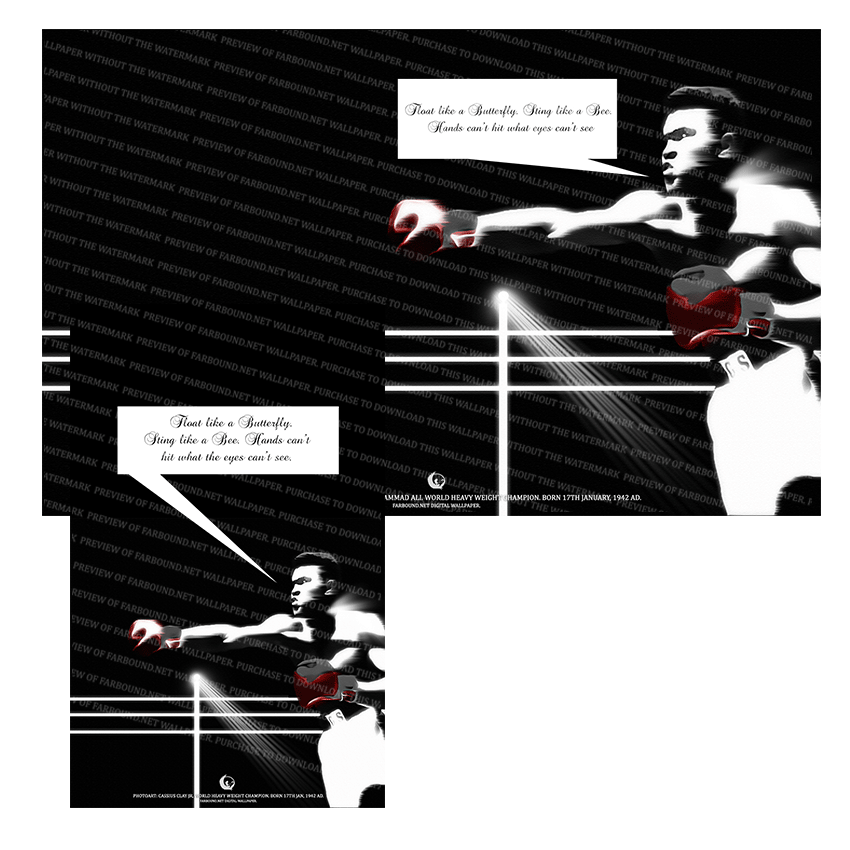 History: This Digital Wallpaper/Desktop Wallpaper/Desktop Background/Laptop Wallpaper/Mobile Phone Wallpaper/Black and White Wallpaper/Famous people Wallpaper for commemorating, honoring and remembering famous people, features a photoart presentation of Cassius Marcellus Clay Jr, more popularly known as Muhammad Ali. Born on the 17th of January in 1942 Ad, Muhammad Ali was a professional boxer and the world heavy weight champion. Muhammad Ali is widely regarded to be the greatest heavyweight boxing champion of all time. The wallpaper also features the following and very famous quote of Muhammad Ali, Float like a butterfly, sting like a Bee. Hands can't hit what eyes can't see.