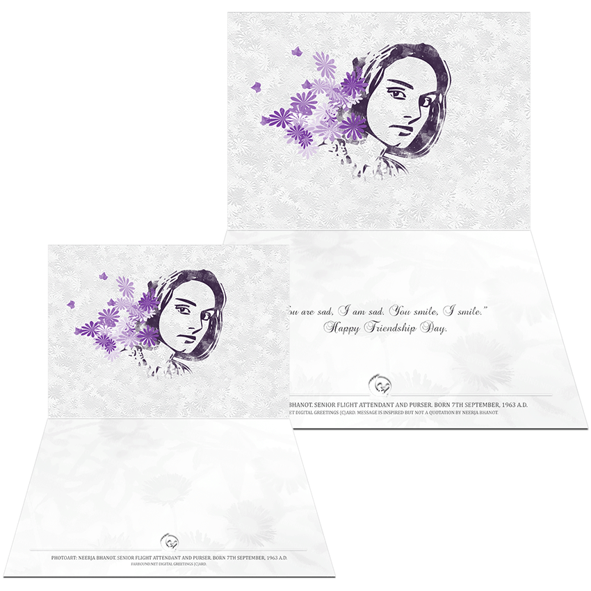 History: This Greetings Card/Sentimental Card/Friendship Day Card for commemorating historical people and expressing heartfelt sentiments to a friend, features a photoart presentation of Neerja Bhanot. Born on the 7th of September in 1963 Ce, Neerja Bhanot was a senior flight attendant and purser. She was posthumously awarded the Ashoka Chakra for bravely shielding children from terrorist gunfire onboard the hijacked Pan Am flight 73 in 1986 Ce. Neerja Bhanot was also awarded Pakistan's highest civilian award, the Tamgha-e-Pakistan and the U.S. Justice for Crime award.