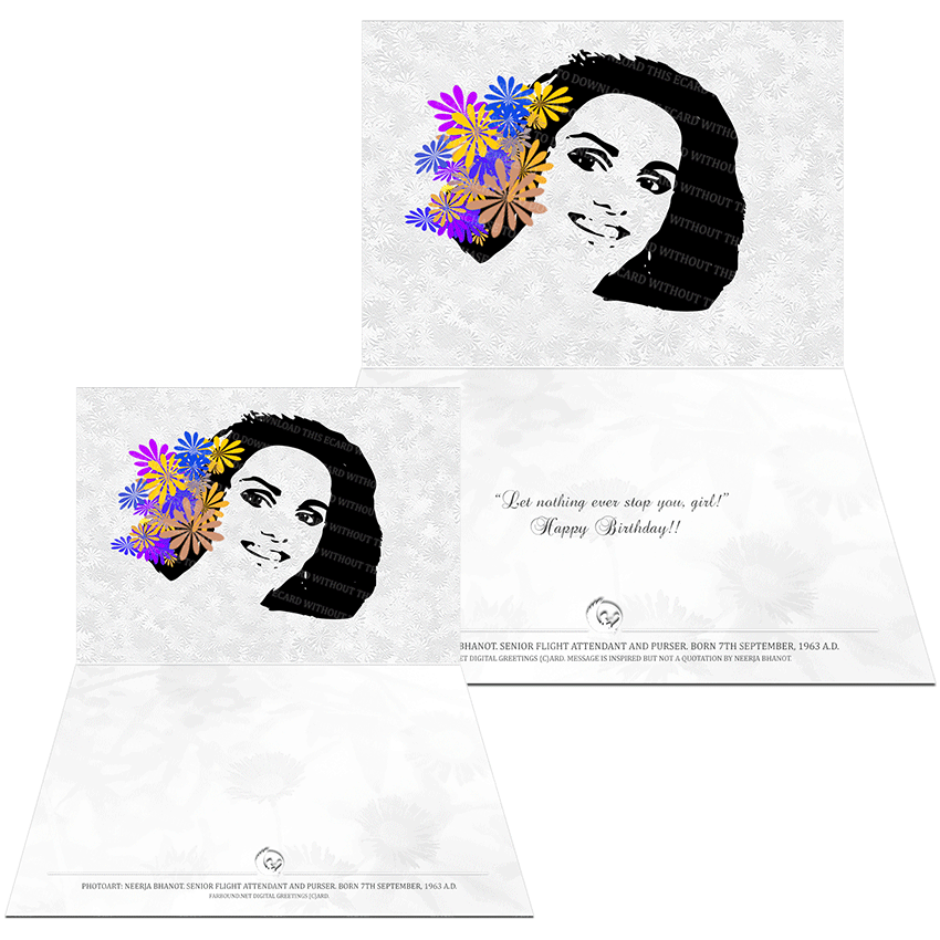 History: This Greetings Card for Birthdays features a photoart representation of Neerja Bhanot. Born on the 7th of September in 1963 Ce., Neerja Bhanot was a senior flight attendant and purser. She was posthumously awarded the Ashoka Chakra for bravely shielding children from terrorist gunfire onboard the hijacked Pan Am flight 73 in 1986 Ce. For her bravery, she was also posthumously awarded Pakistan's highest civilian award, the Tamgha-e-Pakistan and the U.S. Justice for Crime award.