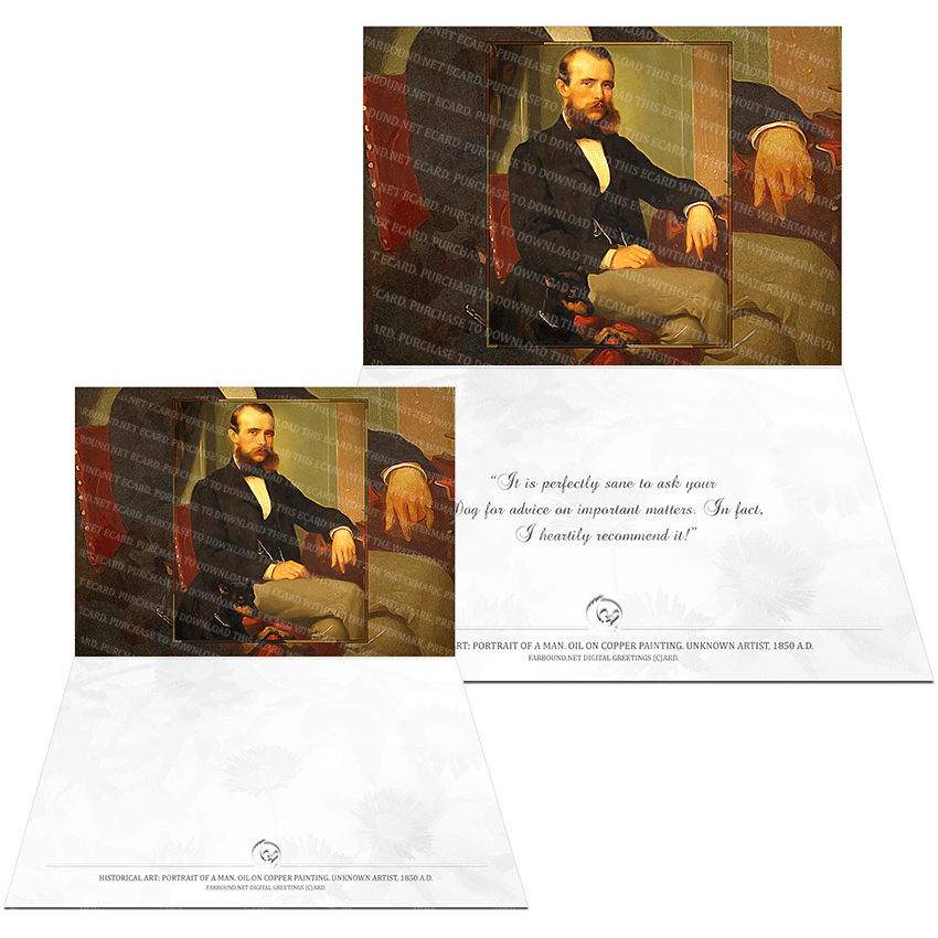 History: This Greetings Card for Dog Lovers features a historical painting titled,'Portrait of a Man'. The painting is an oil on copper painting and was produced by unknown artist in 1850 Ad.