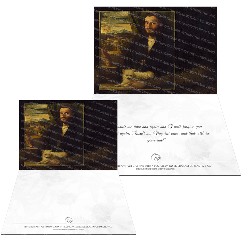 History: This Greetings Card for Dog Lovers features a historical painting titled 'Portrait of a man with a Dog'. The painting is an oil on panel painting and was produced by artist Giovanni Cariani in 1520 Ad. The original Painting is with the National Gallery of Art, U.S.