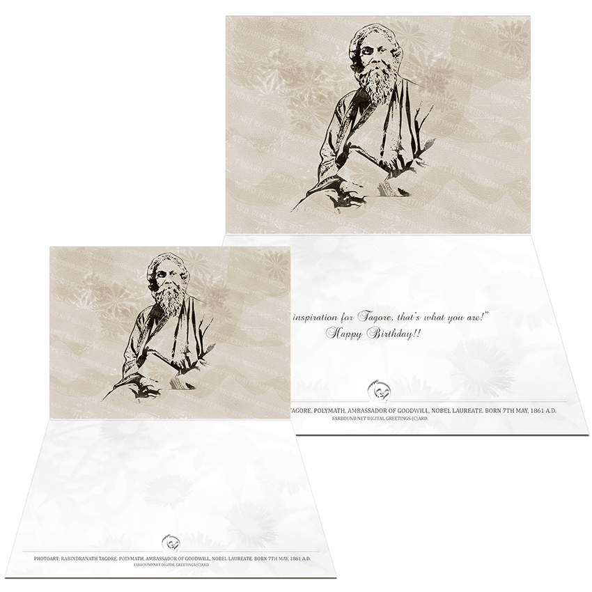 History: This Greetings Card for Birthdays features a photoart representation of Rabindranath Thakur (Tagore). Born on the 7th of May in 1861 Ce., Rabindranath Tagore was a Bengali Brahmin polymath, poet and patriot. A British Indian Citizen, Rabindranath Tagore was awarded knighthood by King George V in 1915 Ad. and later served the British Indian Empire as an ambassador of Goodwill. Rabindranath Tagore was also a Nobel Laureate.