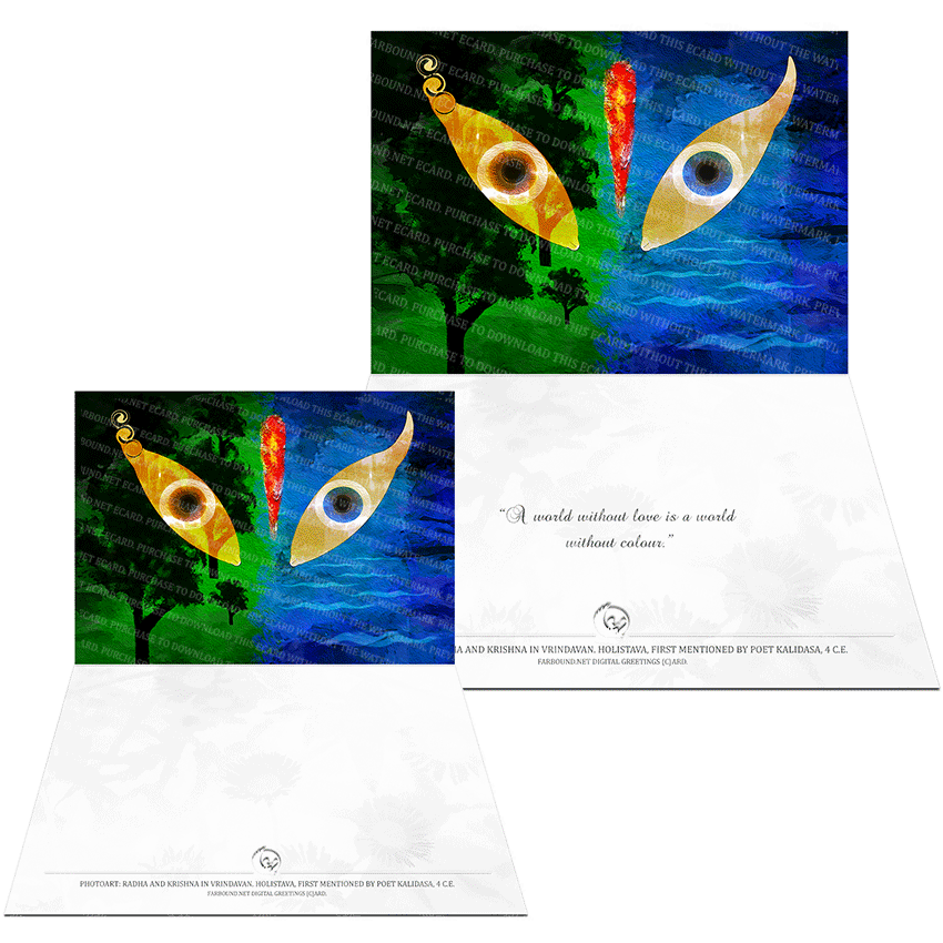 Wish your friends, family and colleagues with a message on love and colours. Or simply send to grow awareness about history, festivals and customs. Our Greetings Cards don’t just let you convey emotions but also educate. This Greetings Card features a photoart presentation of Radha and Krishna in the forest of Vrindavan.