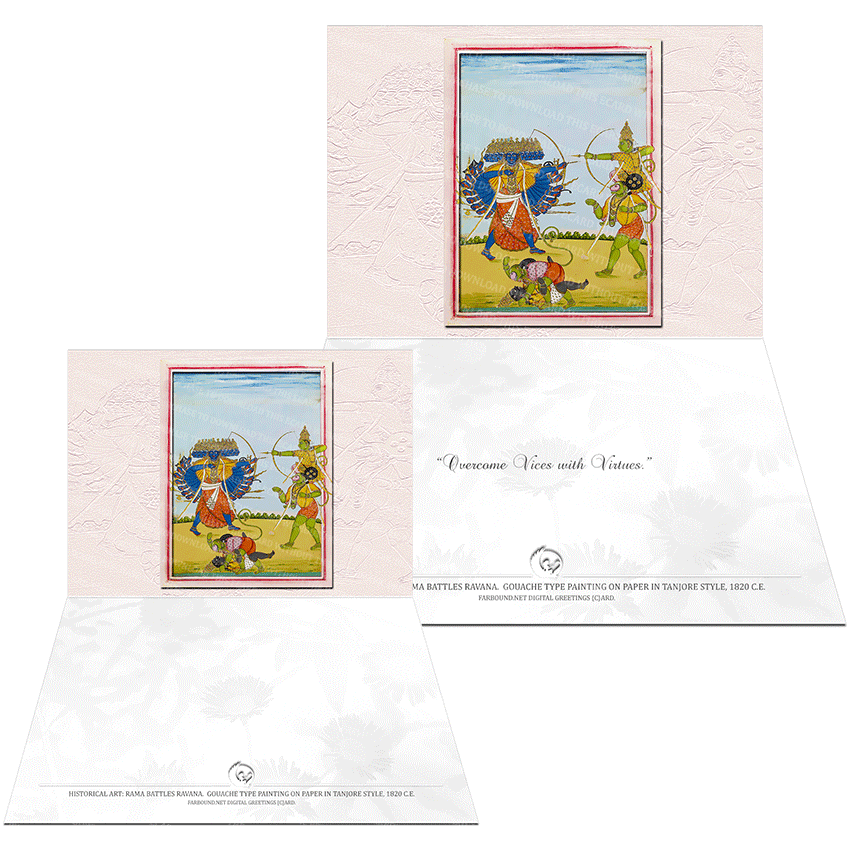 History: This Greetings Card/Good Wishes Card/Festive Card for sending good wishes to friends and family on Dussehra, features a historical painting titled, 'Rama battles Ravana'. The painting is a Gouache on Paper painting, created in the Tanjore style. It was produced in Thanjavur in 1820 Ce. In Hindu scriptures, Lord Rama, the hero of the epic Ramayana, is stated to be the seventh reincarnation of Vishnu. He is described as a cool and composed individual, and a kind-hearted deity. His symbol is the bow and arrow. Furthermore, the festival of Dussehra is said to be the day Rama finally slew Ravana. The original painting is at the British Museum.