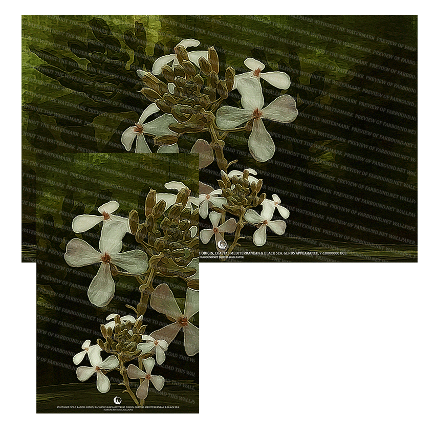 History: This Digital Wallpaper/Desktop Wallpaper/Desktop Background/Laptop Wallpaper/Mobile Phone Wallpaper/Flowers Wallpaper/Wild Radish Flower Wallpaper, features a photoart presentation of Wild Radish Flowers. This species of flowers was named and categorized as the Raphanus Raphanistrum and belong to the genus Raphanus, that is believed to have first appeared on earth 7-10000000 Bce or 7-10 million years ago. The Raphanus Raphanistrum originated in the coastal regions of the Mediterranean and Black Sea, before spreading across the world. The first cultivation of a hybrid species of this plant happened in China. The plant was known to ancient civilizations and people as well, including the ancient Greeks, the Romans and the Egyptians. In Egypt, wild radish was paired with onions and given to workers building the pyramids as salary. The petals of this plant have visible veins.