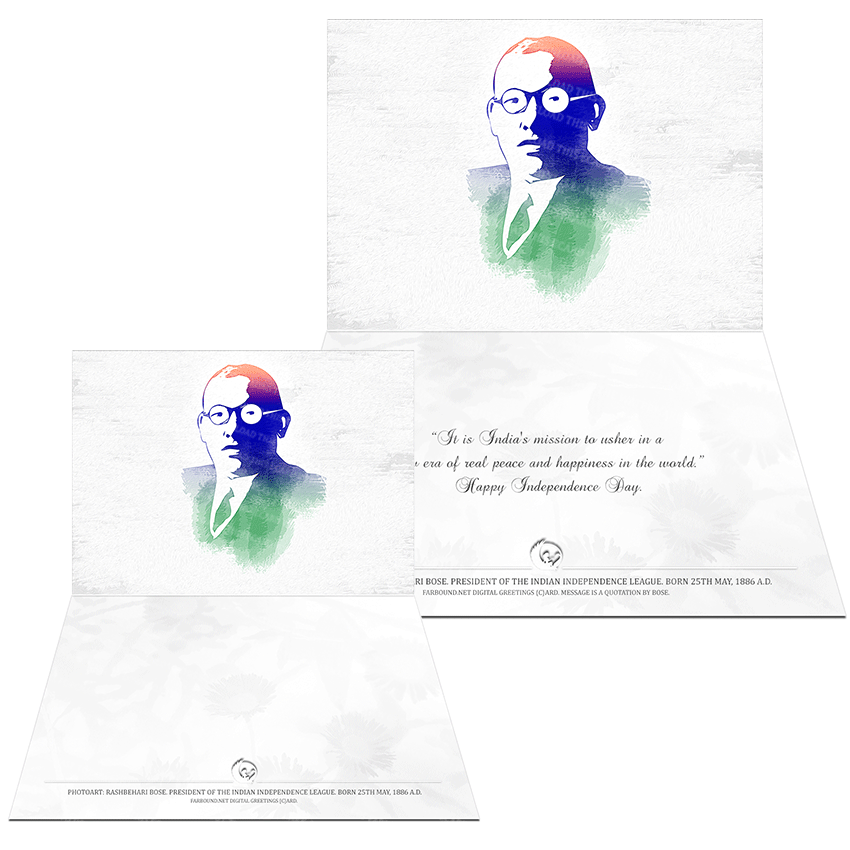 History: This Greetings Card/Independence Day Card/Celebratory Card for commemorating historical people and the Indian Independence Movement, features a photoart presentation of Rashbehari Bose. Born on the 25th of May in 1886 Ce, Rashbehari Bose was an Indian extremist, an Indian revolutionary and an Indian political activist. In 1912 Ce., he was behind the assassination attempt on the life of the Viceroy of India, Charles Hardinge and a key conspirator in the Gadar Mutiny. Rashbehari Bose was also president of the Indian Independence League. A wanted person in British India, from 1915 Ce, till his death in 1945 Ce, Bose lived in Japan. Though not widely celebrated, as his more illustrious successor Subash Chandra Bose, Rashbehari Bose was a part of the Indian Freedom Movement.