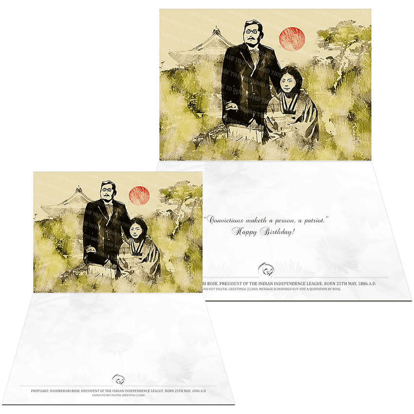 History: This Greetings Card for Birthdays features a photoart presentation of Rashbehari Bose. Born on the 25th of May in 1886 Ce., Rashbehari Bose was an extremist, a patriot and a political activist. In 1912 Ce., he was behind the assassination attempt on the life of the Viceroy of India, Charles Hardinge and a key conspirator in the Gadar Mutiny. He was also president of the Indian Independence League. A wanted person in British India, from 1915 Ce. till his death in 1945 Ce., Bose lived in Japan.