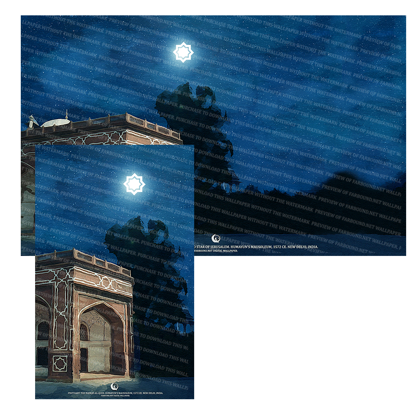 Download and decorate your desktop, laptop and mobile phone with monuments, mausoleums and history. This wallpaper features a photoart presentation of the Najmat al Quds star shining over Humayun’s Mausoleum, built in 1572 Ce. A symbolic representation of the Dome of the Rock Shrine in Jerusalem, the Najmat al Quds is an eight pointed star design, and is also known as the Star of Jerusalem.