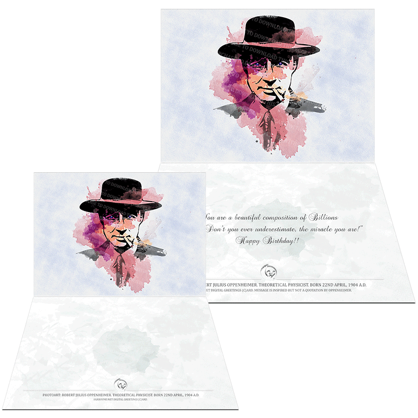 History: This Greetings Card for Birthdays features a photoart representation of Robert Julius Oppenheimer. Born on the 22nd of April in 1904 Ad., Robert Oppenheimer was a theoretical physicist. During World War II, Robert Oppenheimer was instrumental in bringing about a scientific revolution in weapons technology - with the creation of the world's first atomic bomb.