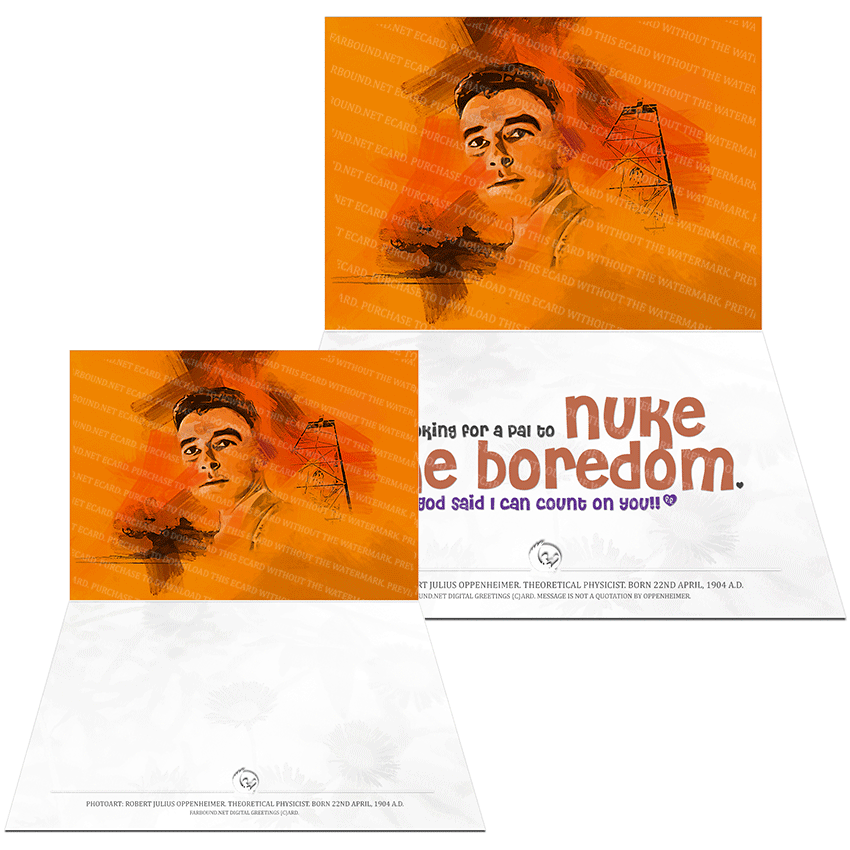 History: This Greetings Card/Invitations Card/Invite for informal social occasions, features a photoart representation of theoretical physicist Robert Julius Oppenheimer. Born on the 22nd of April in 1904 Ad, Robert Oppenheimer was instrumental in bringing about a scientific revolution in weapons technology, with the creation of the world's first atomic bomb.