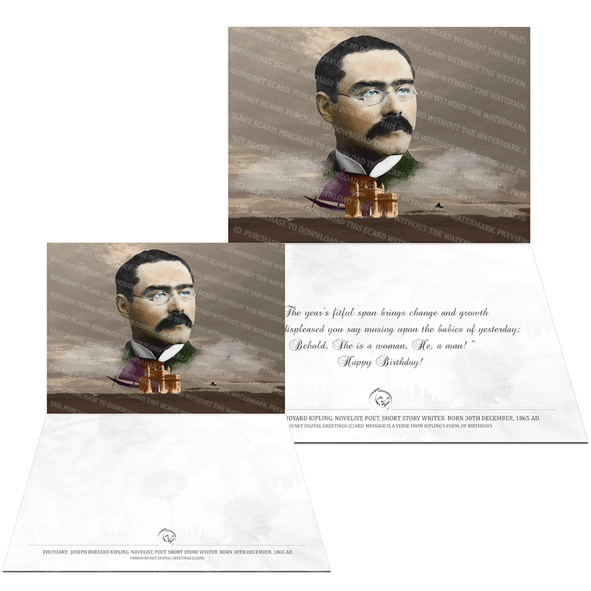 History: This Farbound.Net Greetings Card for Birthdays features an artistic presentation of Joseph Rudyard Kipling, better known as Rudyard Kipling. Born on the 30th of December in 1865 Ad, Rudyard Kipling was a novelist, short story writer and poet. His famous literary works include, The Man Who Would Be King, Kim, the Jungle Book and Gunga Din, among which the Jungle Book is one of his most widely known works.
