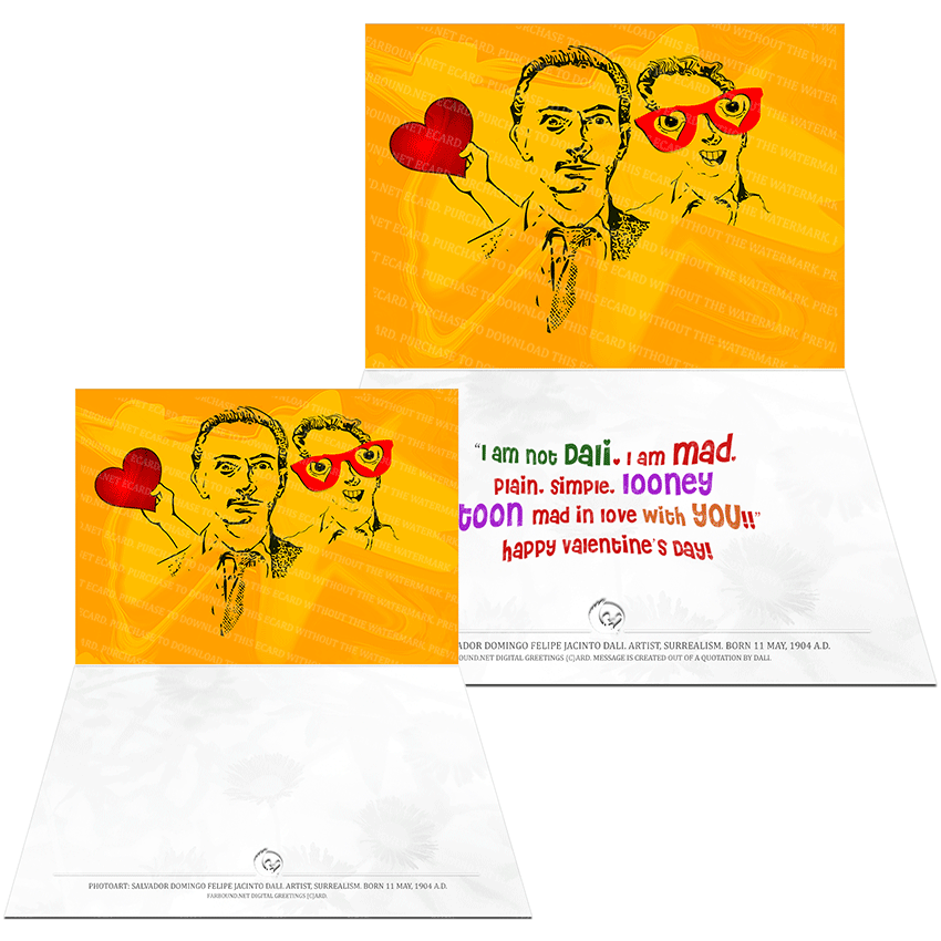 History: This Greetings Card/Valentine's Day Card, features a photoart presentation of Salvador Domingo Felipe Jacinto Dali. Born on the 11th of May in 1904 Ad, Salvador Dali was a Spanish artist excelling in the Surrealism genre of art.