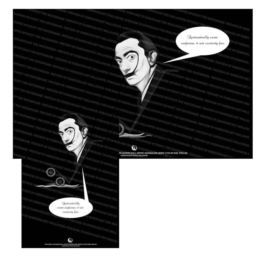 History: This Digital Wallpaper/Desktop Wallpaper/Desktop Background/Laptop Wallpaper/Mobile Phone Wallpaper/Black and White Wallpaper/Famous people Wallpaper for commemorating, honoring and remembering famous people, features a photoart presentation of Salvador Domingo Felipe Jacinto Dali, more popularly known as Salvador Dali. Born on the 11th of May in 1904 Ad, Salvador Dali was a famous Spanish artist of the surrealism genre of art. The wallpaper also features a Quote by Salvador Dali on creativity.