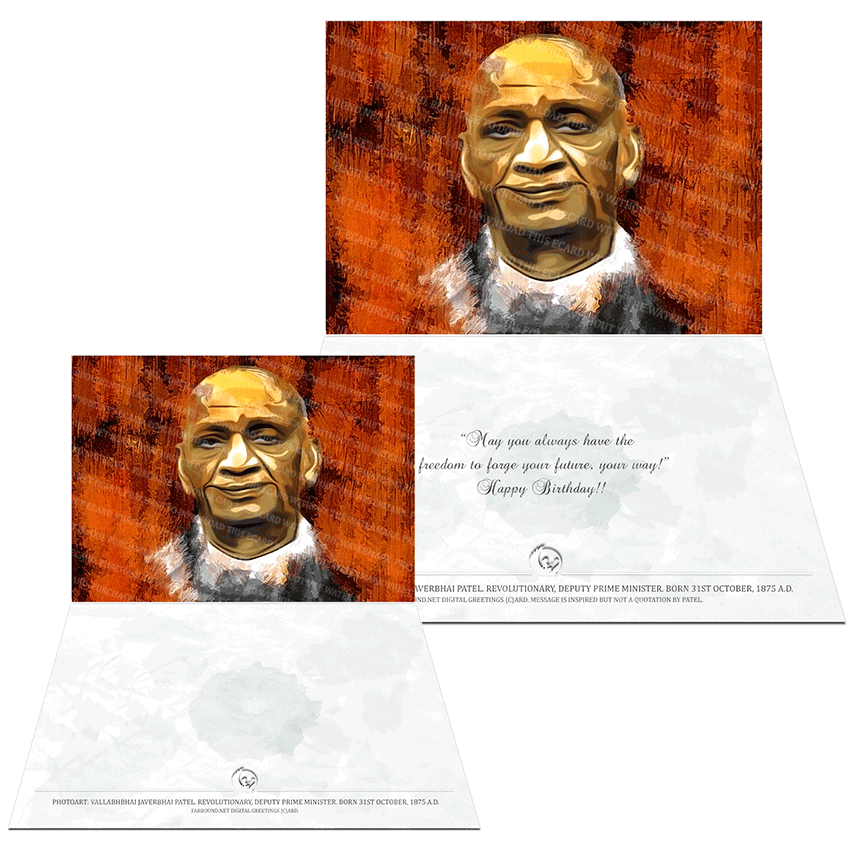 History: This Greetings Card for Birthdays features a photoart presentation of Sardar Vallabhbhai Javerbhai Patel. Born on the 31st of October in 1875 Ce, Vallabhbhai Patel was an Indian revolutionary and later the Deputy Prime Minister of India.