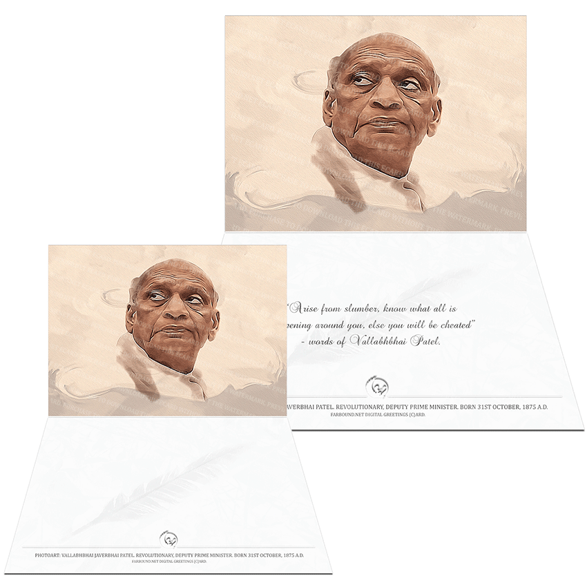 History: This Greetings Card with a Genuine Quotation features a photoart presentation of Sardar Vallabhbhai Javerbhai Patel. Born on the 31st of October in 1875 Ce, Vallabhbhai Patel was an Indian revolutionary and later the Deputy Prime Minister of India.