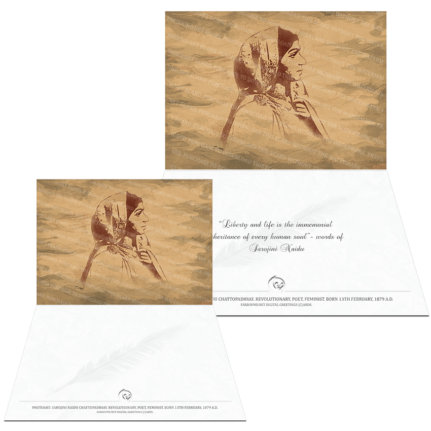 History: This Greetings Card with a Genuine Quotation features a photoart presentation of Sarojini Chattopadhyay Naidu. Born on the 13th of February in 1879 Ce., Sarojini Naidu was a Bengali feminist, a poet, and a revolutionary. She was also the first Indian woman to be appointed as Governor of an Indian state, then known as the United Provinces and now the state of Uttar Pradesh.