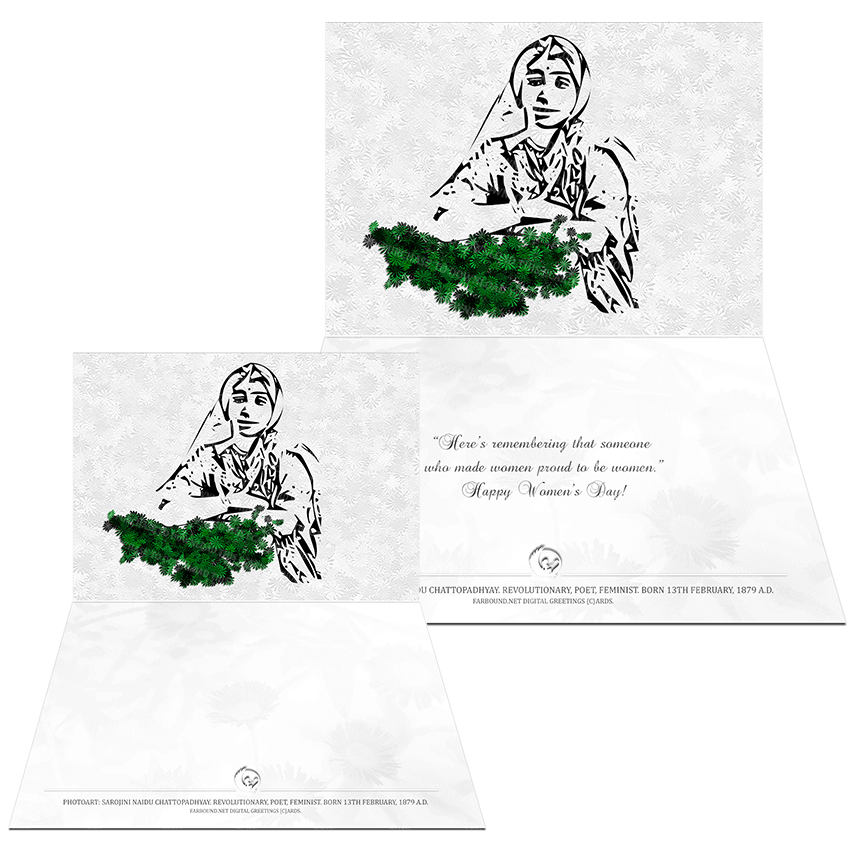 History: This Greetings Card for Women's Day features a photart presentation of Sarojini Chattopadhyay Naidu. Born on the 13th of February in 1879 A.D., Sarojini Naidu was a Bengali feminist, a poet, and a revolutionary. She was also the first Indian woman to be appointed as Governor of an Indian state, then known as the United Provinces and now the state of Uttar Pradesh.