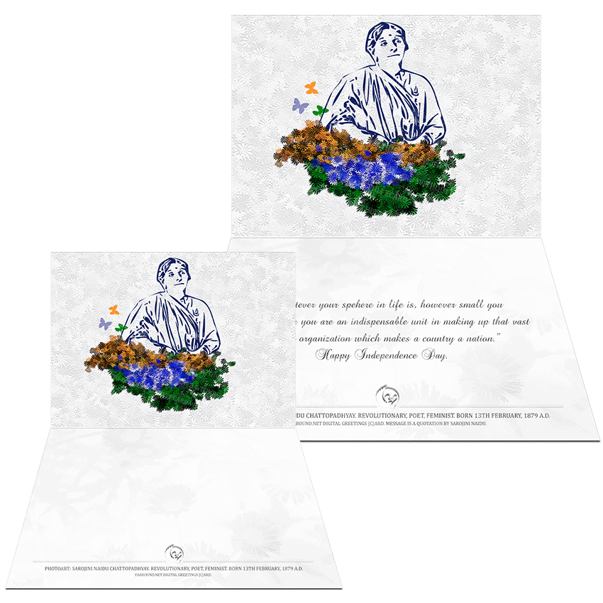 History: This Greetings Card/Independence Day Card/Celebratory Card for commemorating historical people and the Indian Independence Movement, features a photoart presentation of Sarojini Chattopadhyay Naidu. Born on the 13th of February in 1879 Ce, Sarojini Naidu was an Indian revolutionary and an Indian political activist. She was also a feminist and a poet. Sarojini Naidu was the first Indian woman to be appointed as Governor of an Indian state, then known as the United Provinces, now the state of Uttar Pradesh. Sarojini Naidu was a prominent member of the Indian Freedom Movement.