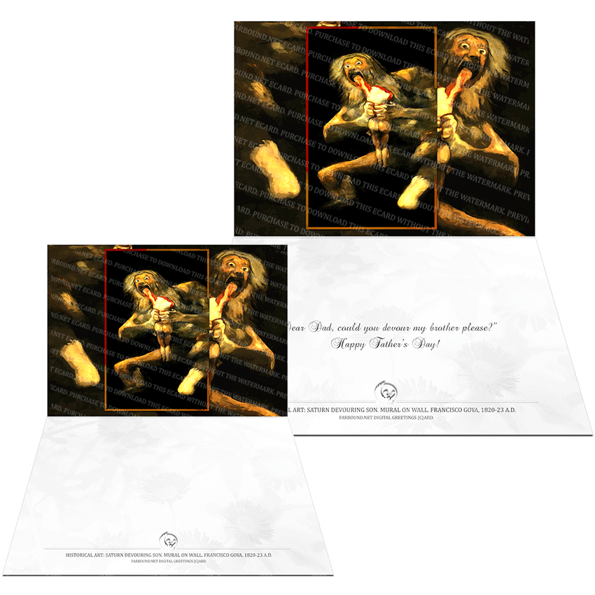History: This Greetings Card/Father's Day Card for Father's Day features a historical painting titled, 'Saturn Devours Son'. The painting is a wall mural and was produced by artist Francisco Jose De Goya Lucientes between 1820-23 Ad. It is said Francisco Goya originally created this piece of art on the walls of his kitchen, and it was later transferred onto canvas. The painting belongs to a series of paintings categorized as the 'Black Paintings'. The theme of Saturn Devouring his Son comes from Greek Mythology. The painting is with the Museo Nacional Del Prado, the Spanish National Art Museum.