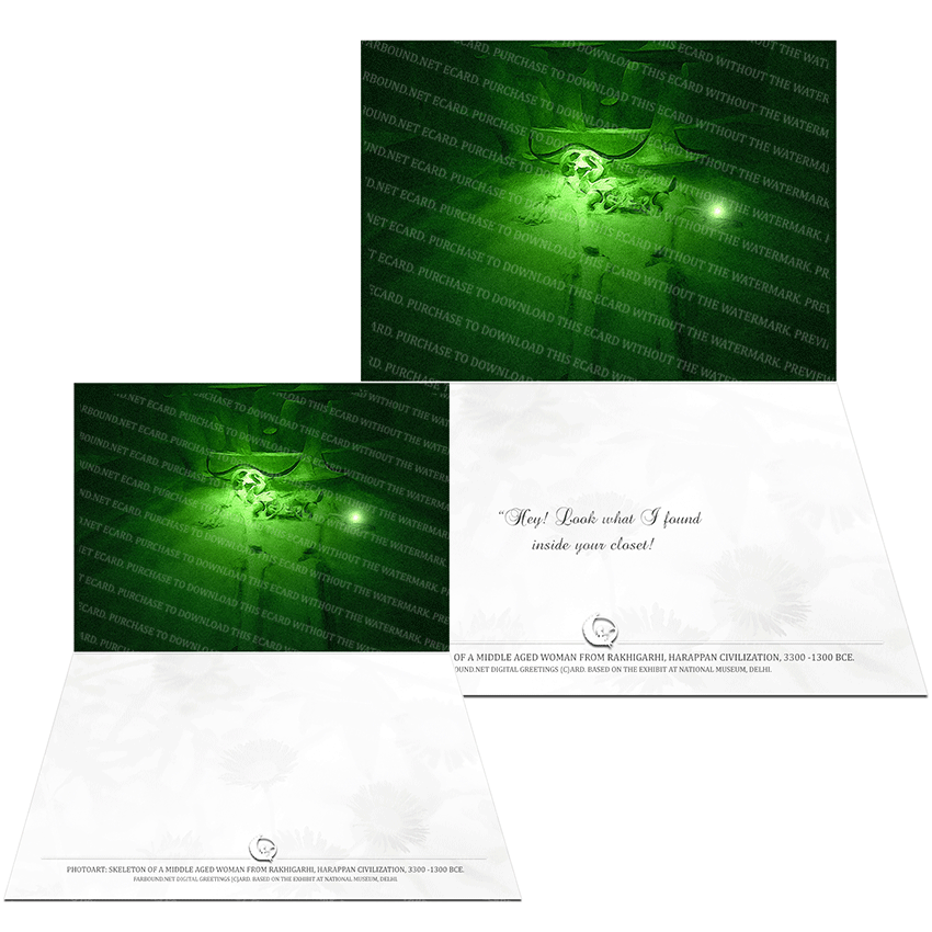 History: This Greetings Card/Funny Card/Witty Card with a Humorous take on skeletons in the closet, features a photoart presentation of the skeleton of a middle aged woman from the Harappan settlement of Rakhigarghi. To know more, see the Farbound.Net story: Who were the Harappans? The artistic presentation is based on an exhibit on display at the National Museum Delhi.