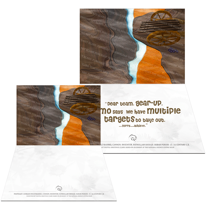 History: This Greetings Card/Funny Card/Witty Card with a humorous take on achieving targets in the corporate world, features a photoart presentation of a Gurkani multibarrel cannon. The ordnance was invented by Fateullah of Shiraz, a courtier, minister and scholarly inventor, who lived during the reign of the third Gurkani emperor Jalal-ud-din Muhammad Akbar. To know more, see the Farbound.Net story: A forefather of modern age artillery - the Gurkani multi barrel cannon. The exhibit/replica on which this artistic presentation is based can be seen at the National Science Center in Delhi.