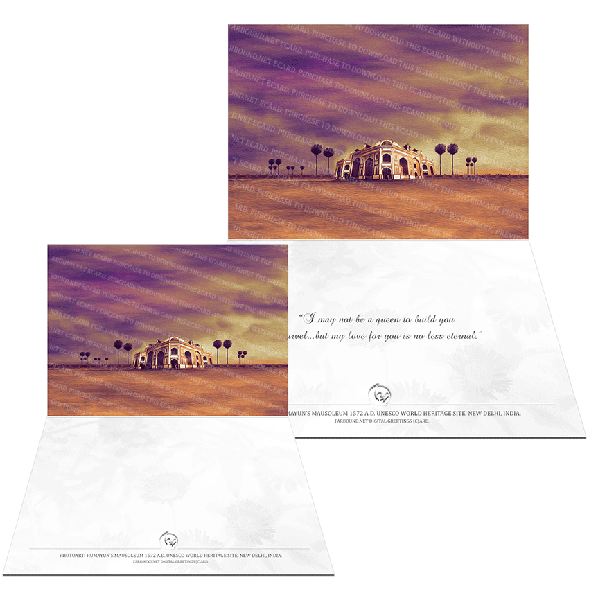 History: This Greetings Card/Sentimental Card/Romantic Card for expressing heartfelt sentiments, features a photoart presentation of a Humayun's Mausoleum in New Delhi, India. The mausoleum is a UNESCO World Heritage site and was one of the first architectural marvels to be built by the Gurkanis (Mughals). The mammoth structure was sponsored by Bega Begum, queen and chief consort of the second Gurkani (Mughal) emperor, Nasir-ud-din-Muhammad Humayun.