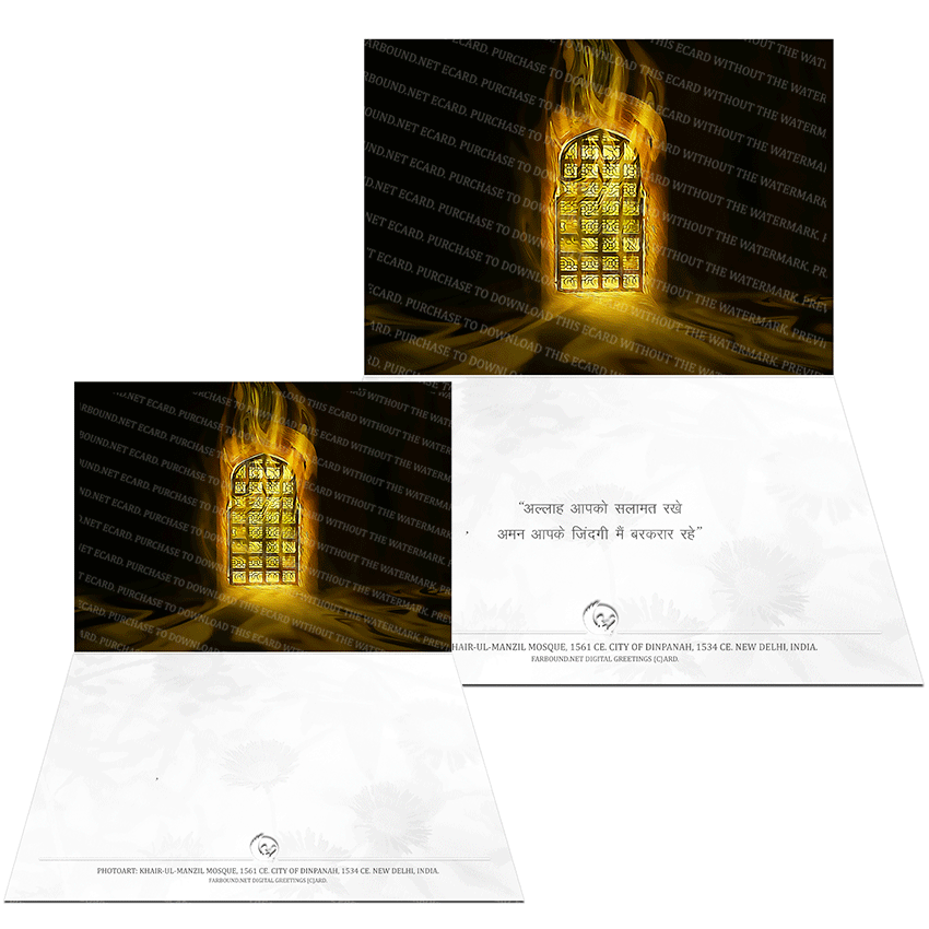History: This Greetings Card/Good Wishes Card/Festive Card for sending good wishes to friends and family, features a photoart presentation of a lattice window at the Khair-ul-Manzil mosque. A Gurkani (Mughal) era mosque cum madrassa, the Khair-ul-Manzil was built in the 15th Century. Its sponsoring benefactor was Maham Agna, the wet nurse of the third Gurkani (Mughal) emperor Jalal-ud-din Muhammad Akbar, see Farbound.Net snippet: Built by a woman prime minister of the Mughal court. The card is meant for Eid, Ramadan, Muharram, Hajj, Ashura or any other Special Occasion. The message in the Prewritten version of the card is in Hindi.