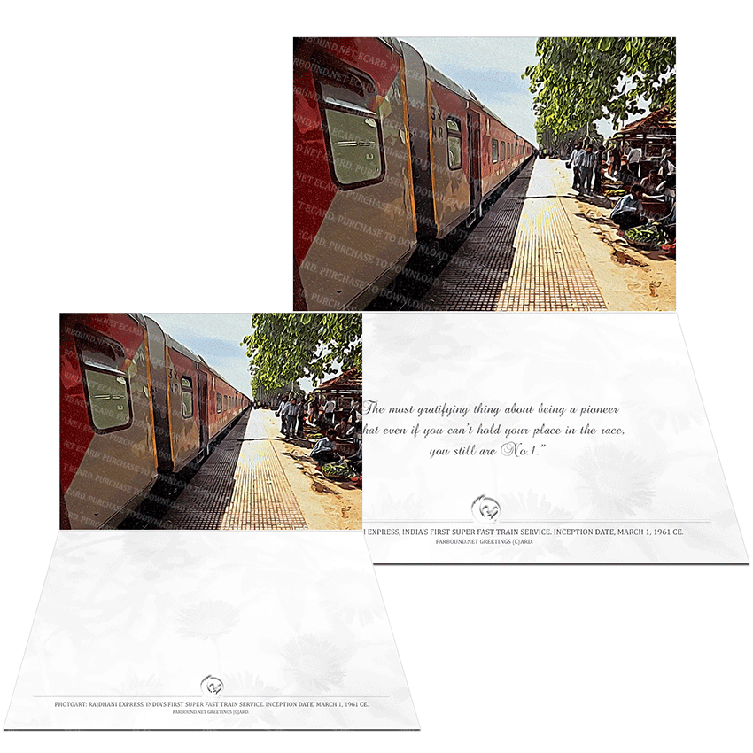 History: This Greetings Card/Funny Card/Witty Card with a thoughtful and Humorous take on being a pioneer, features a photart presentation of a train of the Rajdhani family of Super Fast passenger trains. Incepted on the 1st of March in 1969 Ce, the Rajdhani train service was India's first superfast train service. The name 'Rajdhani" means a 'Capital City'. The train service was named Rajdhani because it connected the capital cities. To know more, see the Farbound.Net story, Rajdhani Express, first of the superfasts.