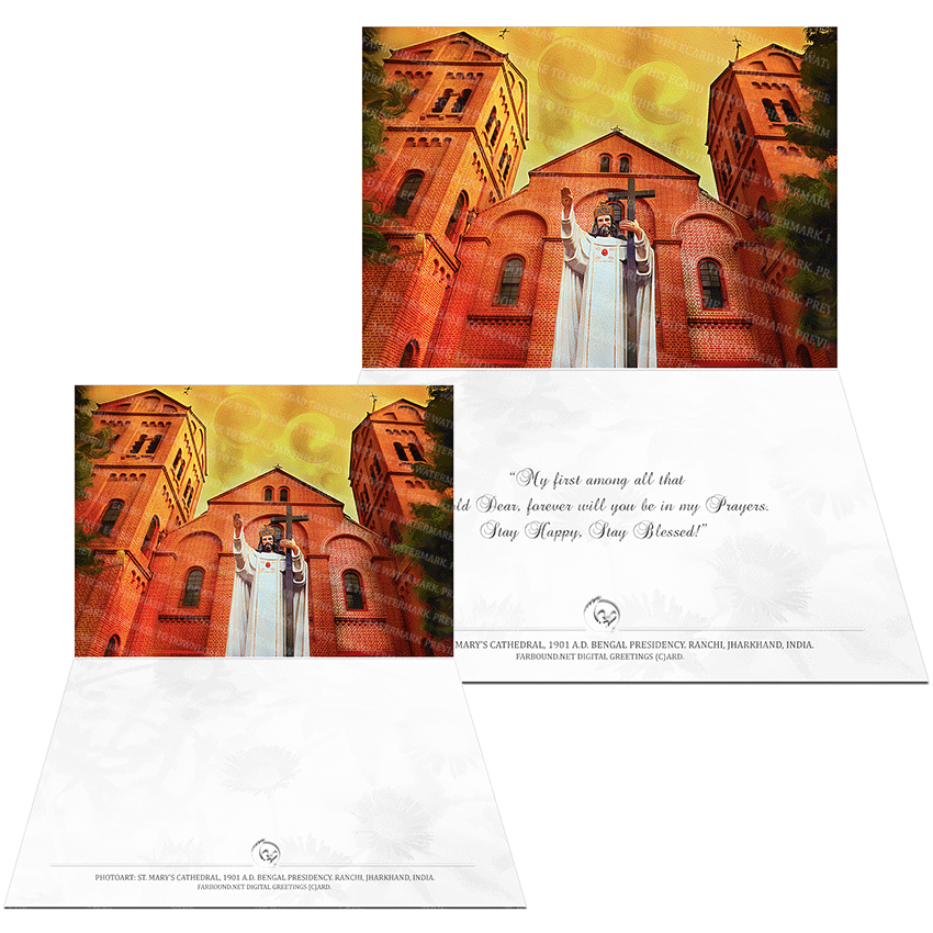 History: This Greetings Card/Sentimental Card/Christian Card for expressing heartfelt sentiments, warm wishes and give blessings, features a photoart presentation of the St. Mary's Cathedral in Ranchi, Jharkhand, India. Though the present-day structure of the church was built in 1901 Ad, the roots of this institution goes farther back to 1885 Ad, when a group of Belgian Jesuits, particularly one Father Constant Lievens, stood up for the human rights of the deprived Munda people and helped them win back their lands and self-respect. To learn more about St. Mary's Cathedral, see the Farbound.Net snippet: Human rights before religion.