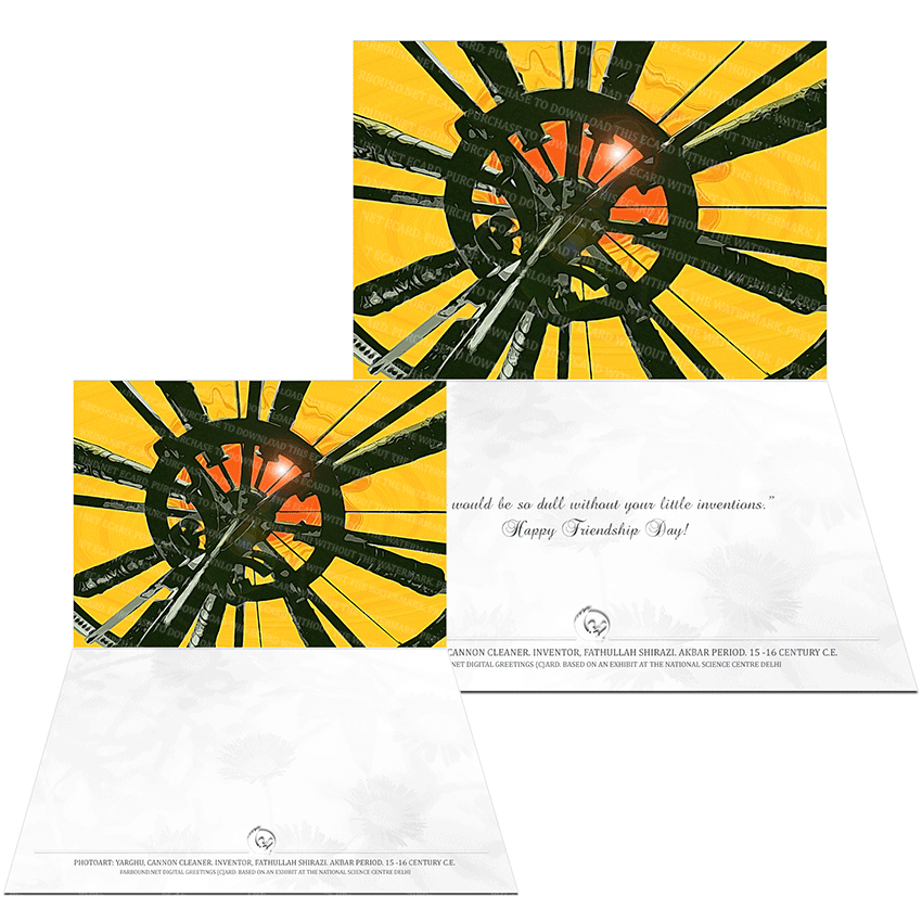 History: This Greetings Card/Sentimental Card/Friendship Day Card for expressing heartfelt sentiments to a friend, features a photoart presentation of the Yarghu, a Gurkani (Mughal) era cannon cleaner. Invented by Fathullah of Shiraz, a Persian (Iranian) courtier, minister and inventor, who lived during the reign of Gurkani (Mughal) emperor Jalal-ud-din Muhammad Akbar, the Yarghu was a cumbersome yet unique contraption from the 15th century. It was used for cleaning multiple midsize cannons, simultaneously. The name 'Yarghu' is an old Mongolian word and was the name of a court of officials tasked with investigating and punishing corrupt officials. Its association with the later contraption, if it was indeed the Mongolian name, was very likely a hint of the Gurkani's (Mughal) ancestral ties with the Mongol people, specially Genghis Khan and Timur. To know more see the Farbound.Net snippet: What men could do, Yarghu could do better. The model on which this artistic presentation is based is at the National Science Center Delhi. It is a reconstructed model based on drawings.