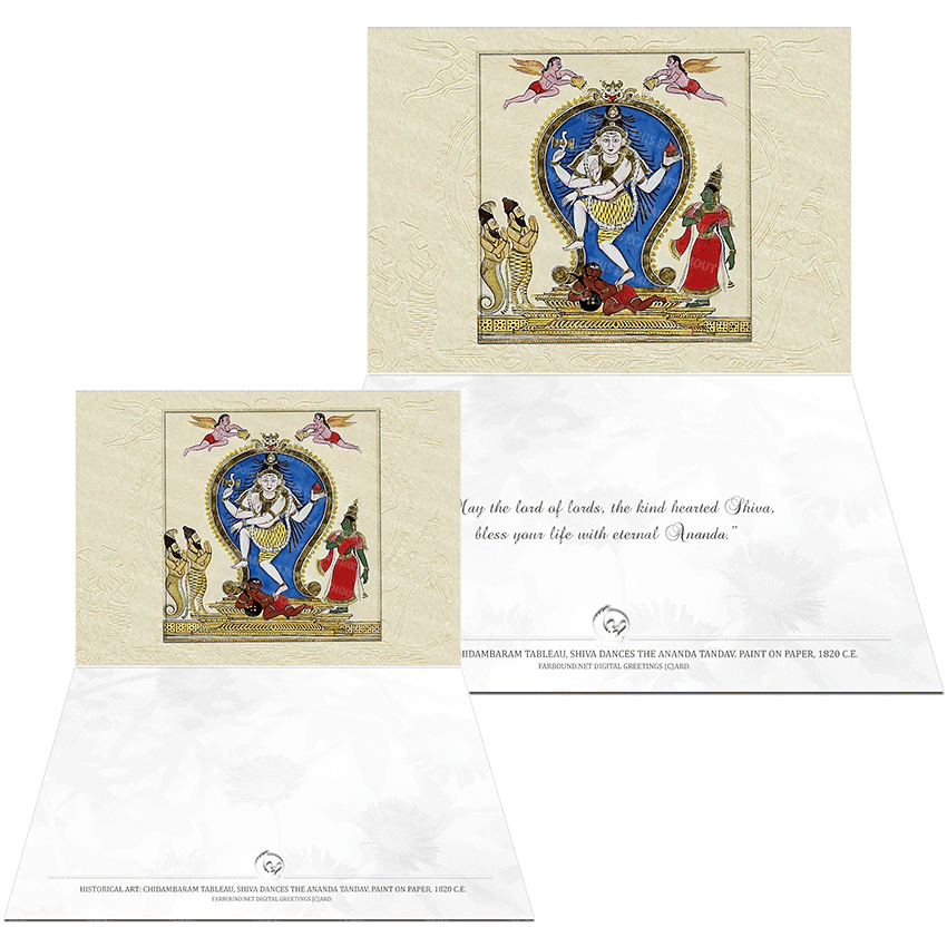 History: This Greetings Card/Good Wishes Card/Festive Card for sending good wishes of everlasting joy and happiness to friends and family, features a historical painting titled,'The Chidambaram Tableau'. The paint on paper painting depicts Shiva dancing the Ananda Tavdava and was produced in 1820 Ce. The original painting is with the British Museum. The card is meant for the festivals of Shivratri, Maha Shivratri, Sawan Shivratri or other any other festival related to Shiva. It can also be sent on non festive special occasions.