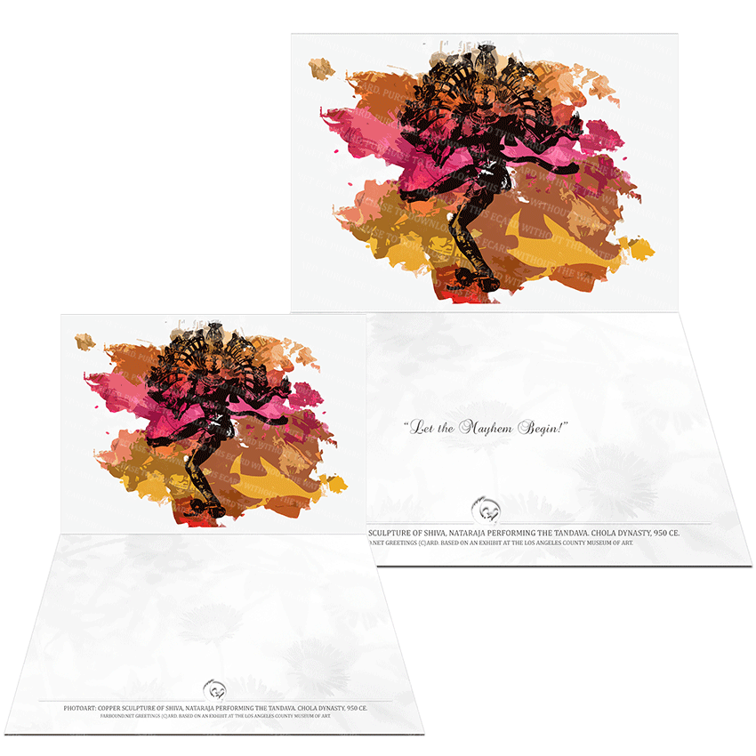 History: This Greetings Card/Invitations Card/Invite for informal social occasions of all sorts including dance parties, features a photoart representation of a copper sculpture of Shiva (Nataraja) performing the Tandava Dance. The sculpture was produced during the Chola period, 950 Ce. The sculpture on which this artistic presentation is based is on exhibit at the Los Angeles County Museum of Art, U.S.