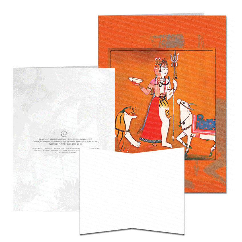 History: This Farbound.Net Greetings Card for print/Anniversary Card for Wedding Anniversaries features, a historical painting titled, Ardhnarisvara. The panting is an opaque watercolour on paper painting and depicts Shiva and Parvati fused together as a half man and half woman figure. The painting, in essence, is said to divide the human anatomy into a male and female half. It attributes the left side of the human brain with femininity and the right side of the brain with masculinity. The painting belongs to the Mankot School of Art, Western Punjab Hills. It was created between 1710 and 1720 Ce. The Printable card can also be spent for other occasions.