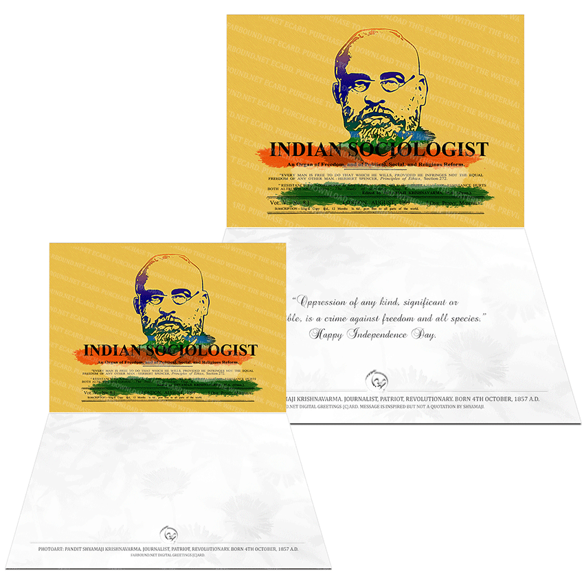 History: This Greetings Card/Independence Day Card/Celebratory Card for commemorating historical people and the Indian Independence Movement, features a photoart presentation of Shyamaji Krishnavarma. Born on the 4th of October in 1857 Ce, Shyamaji Krishnavarma was an Indian revolutionary and an Indian political activist. He was also the founder and chief editor of a journal known as the Indian Sociologist. Shyamaji Krishnavarma is often described as an intellectual anarchist for advocating the use of violence during the Indian Freedom Movement.