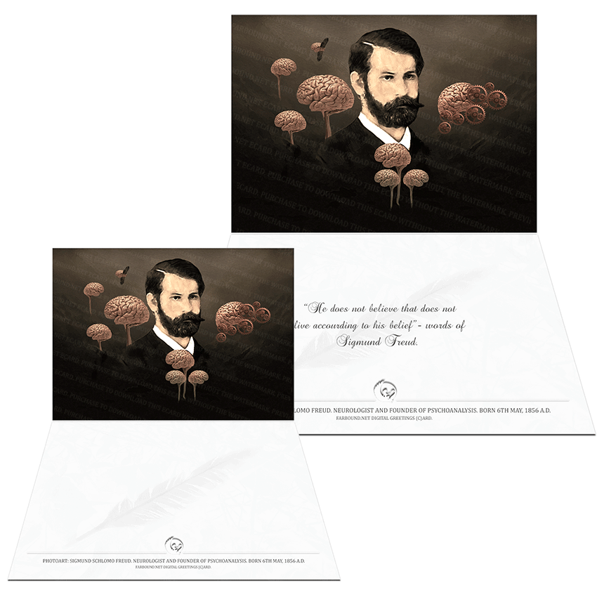 History: This Greetings Card with a Genuine Quotation features a photoart presentation of Sigmund Schlomo Freud. Born on the 6th of May in 1856 A.D. Sigmund Freud was an Austrian neurologist and the father of modern psychoanalysis.