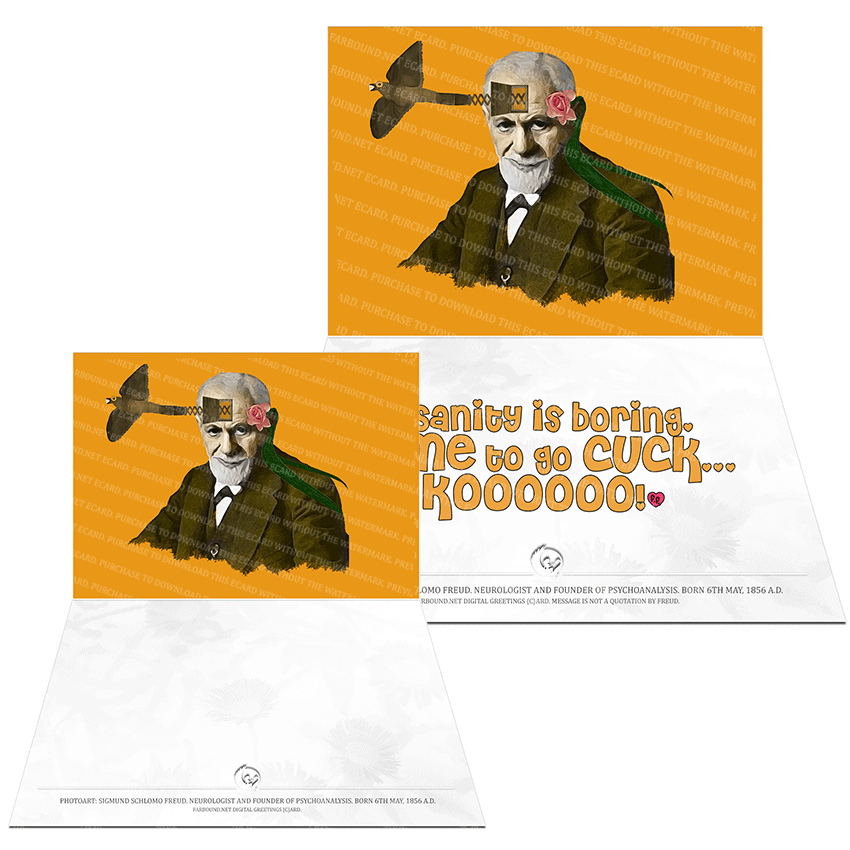 History: This Greetings Card/Invitations Card/Invite for informal social occasions of all sorts, features a photoart representation of Sigmund Schlomo Freud. Born on the 6th of May in 1856 Ad, Sigmund Freud was an Austrian neurologist and the father of modern psychoanalysis.