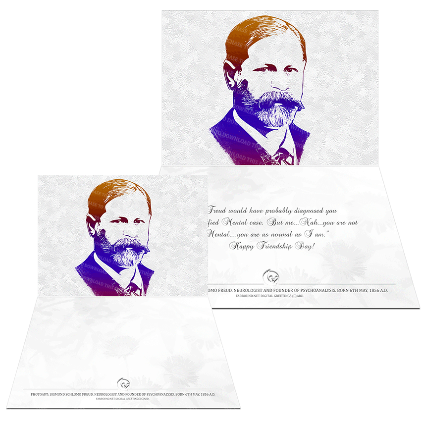 History: This Greetings Card/Sentimental Card/Funny Card/Friendship Day Card for commemorating historical people and expressing heartfelt sentiments to a friend, features a photoart presentation of Sigmund Schlomo Freud. Born on the 6th of May in 1856 Ad, Sigmund Freud was an Austrian neurologist and the father of modern psychoanalysis.