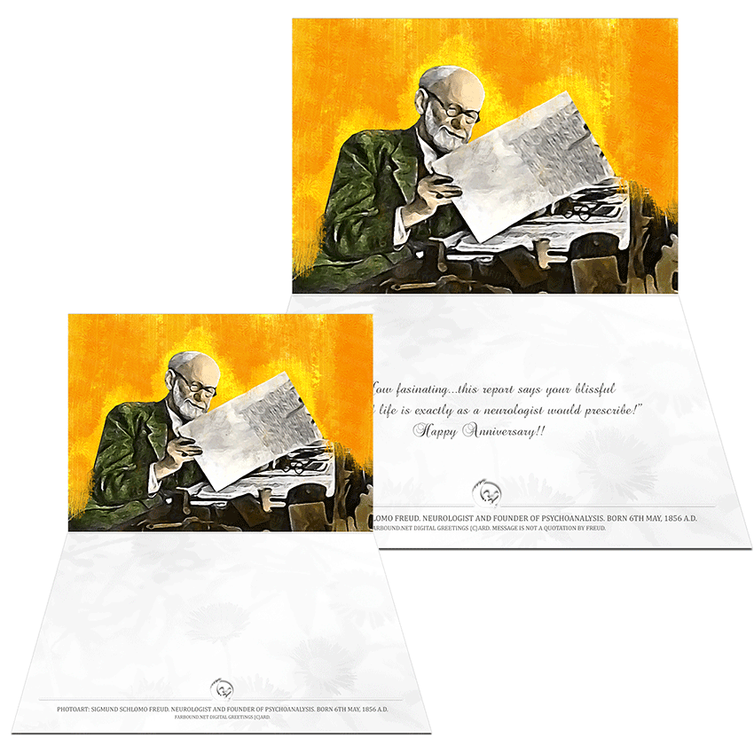 History: This Greetings Card/Anniversary Card for Wedding Anniversaries, features a photoart presentation of Sigmund Schlomo Freud. Born on the 6th of May in 1856 Ad., Sigmund Freud was an Austrian neurologist and the father of modern psychoanalysis.