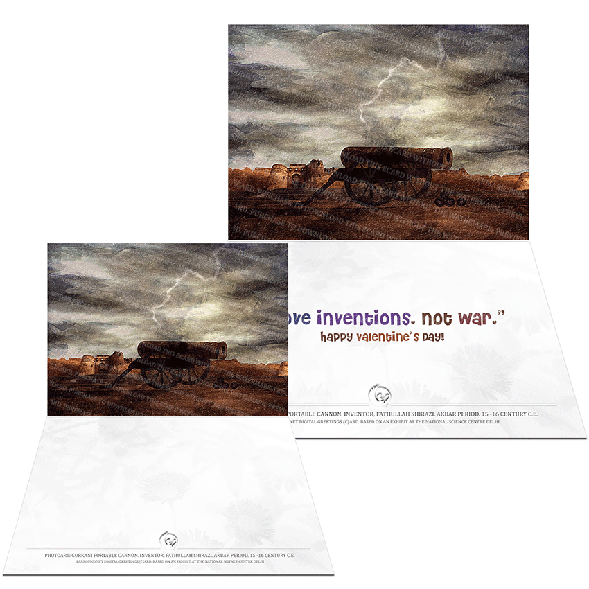 History: This Greetings Card/Valentine's Day Card features, a photoart presentation of a Gurkani (Mughal) era portable cannon. The ordnance was invented by Fateullah of Shiraz, a courtier, minister and scholarly inventor, who lived during the reign of the third Gurkani (Mughal) emperor Jalal-ud-din Muhammad Akbar. It was an assemblage of parts that could be dismantled and transported over uneven and rough terrains, with some historians certain it may indeed have been in active use. The exhibit/replica on which this artistic presentation is based can be seen at the National Science Center in Delhi.