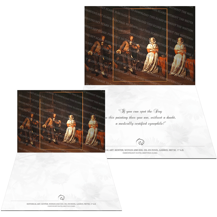 History: This Greetings Card for Dog Lovers features a historical painting titled,'The Hunter and a Woman'. The painting is an oil on panel painting and was produced by artist Gabriel Metsu in the 17th century Ad.