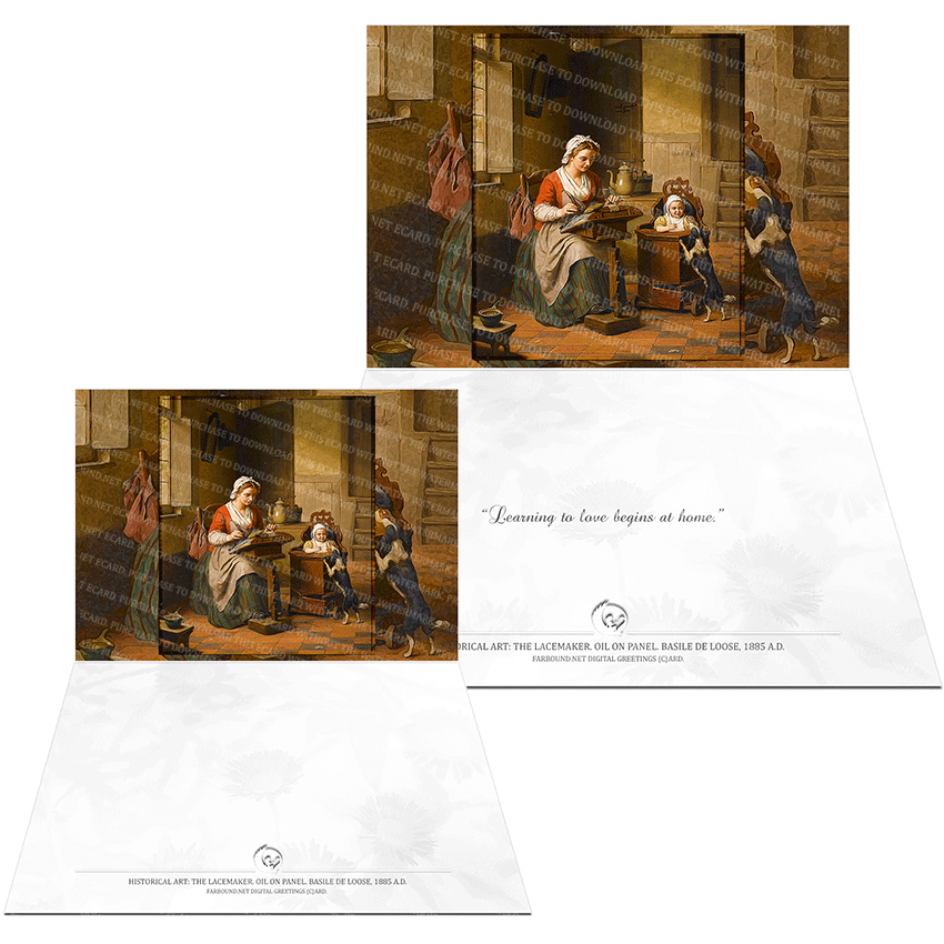 History: This Greetings Card for Dog Lovers features a historical painting titled,'The Lacemaker'. The painting is an oil on panel painting and was produced by artist Basile De Loose in 1885 Ad.