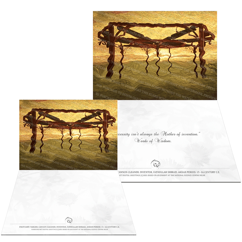 History: This Greetings Card/Meaningful Card with words of wisdom on necessity and invention, features a photoart presentation of the Yarghu, a Gurkani era cannon cleaner. Invented by Fathullah of Shiraz, a Persian (Iranian) courtier, minister and inventor, who lived during the reign of Gurkani emperor Jalal-ud-din Muhammad Akbar, the Yarghu was a cumbersome yet unique contraption from the 15th century. It was used in cleaning multiple midsize cannons, simultaneously. To know more about this Gurkani multi-cannon cleaner, see the Farbound.Net snippet: What men could do, Yarghu could do better. The model on which this artistic presentation is based is at the National Science Center Delhi. It is a reconstructed model based on drawings.