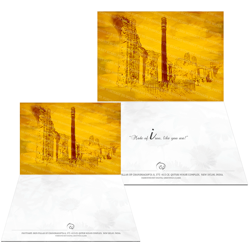 History: This Greetings Card/Compliments Card for expressing admiration and complimenting someone special, features a photoart presentation of the iron pillar of Chandragupta II at the Qutub Minar Complex. The iron pillar of Chandragupta II is believed to have been forged in 4 Ce, during the time of the Gupta Empire. The pillar that stands erect at 7.21 meters was possibly commissioned to celebrate the rule of Chandragupta II, referred to in an inscription on the pillar as Chandra. Besides carrying inscriptions from different dates, the most admirable quality of the pillar is that, for centuries now, it has remained rust-free. A testament to the skills of nameless Turkish artisans who left behind both epic scale buildings and intricate engravings, the Qutub Minar Complex is a collection of incredible architectural monuments dating back to between the 12-13 century Ce.