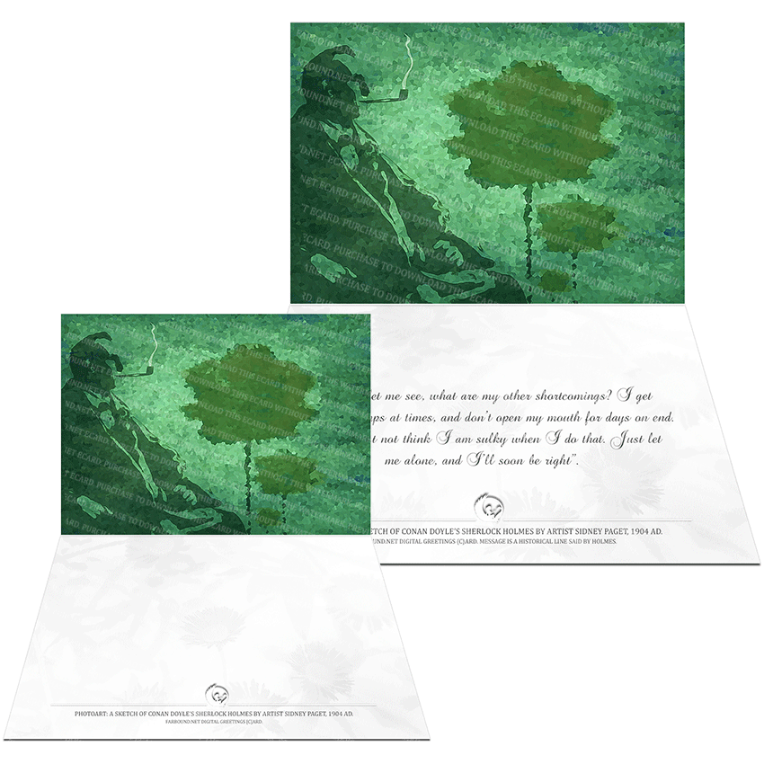 History: This Greetings Card/Sentimental Card/Apology Card features a photoart presentation of a sketch of ace detective Sherlock Holmes. The sketch was created by Sidney Paget in 1904 Ad. Sherlock Holmes is a character created by Sir Arthur Conan Doyle.